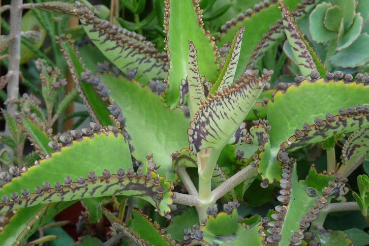Questa kalanchoe è chiamata infatti la “madre di milioni” (dall’inglese "Mother of Millions"), i margini delle foglie sono ricoperte di piantine che cadono e crescono nella terra circostante.