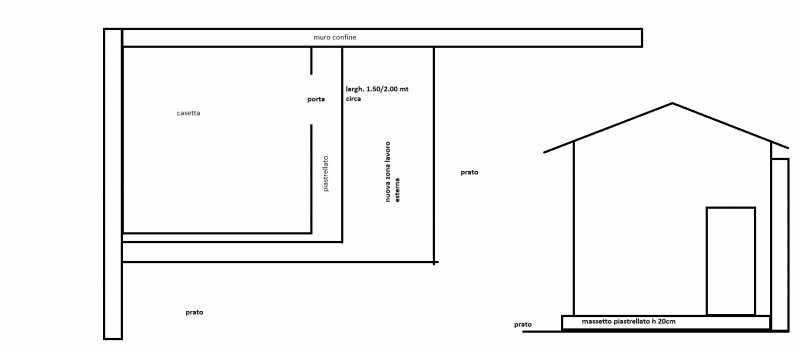 ho una casetta in legno di circa 9 mq, situata ad angolo, che poggia su una base di cemento piastrellato di circa 12 mq.
