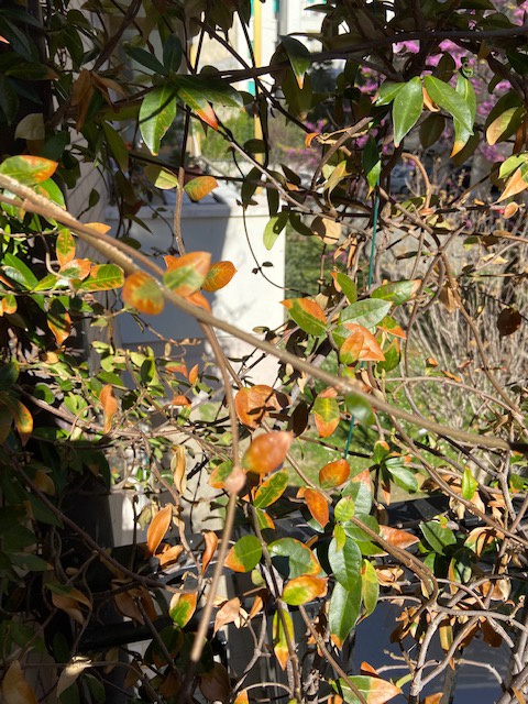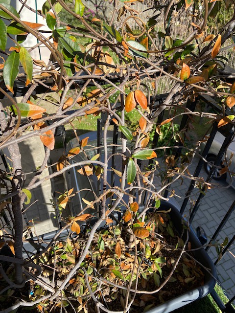 ) Sperando che sia la prima o l'ultima opzione (lo puoi valutare tu in base a come li hai gestiti, spero che i vasi siano bucati sul fondo di modo che l'acqua in eccesso fluisce via), ti consiglio di potarlo di almeno 1/3 per stimolare il ricaccio e concimare con concime stallatico pellettato e ferro in polvere per evitare clorosi ferrica e sostenere il fogliame.
