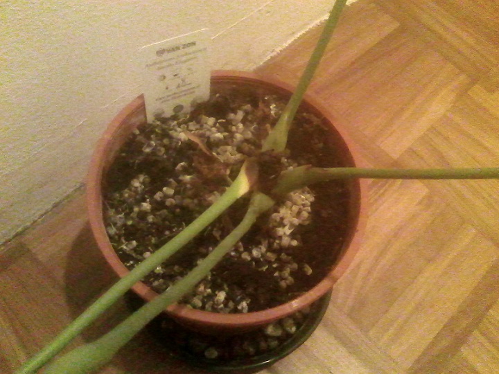 La pianta da quando ci è stata regalata non è mai stata rinvasata e avevamo messo dell'argilla espansa nel sottovaso per aiutare il drenaggio.