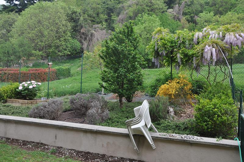 - un giardino sul retro (sopra i box, quindi con pochissima terra), con pergola e una grossa aiuola (con piena terra verso la montagna)