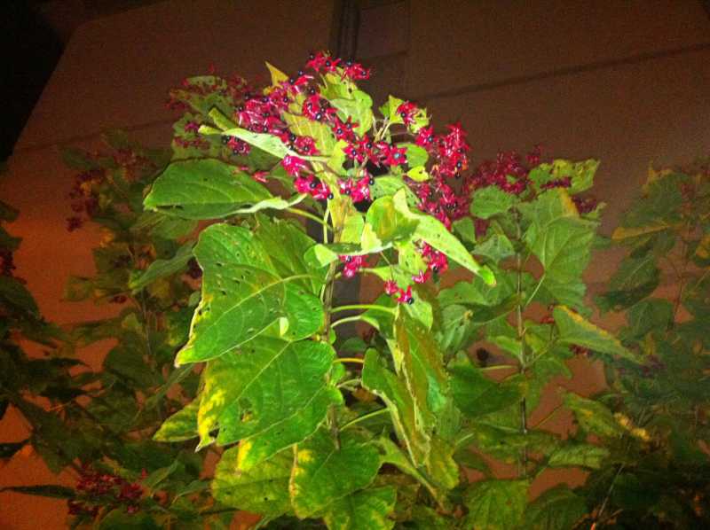 e Clerodendrum tricotomum - quelli rossi non sono i fiori che sono bianchi, ma il calice che da verde diventa rosso quando maturano i semi che sono quelle palline bluastre.
