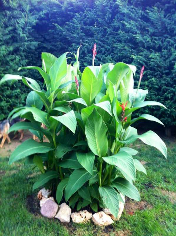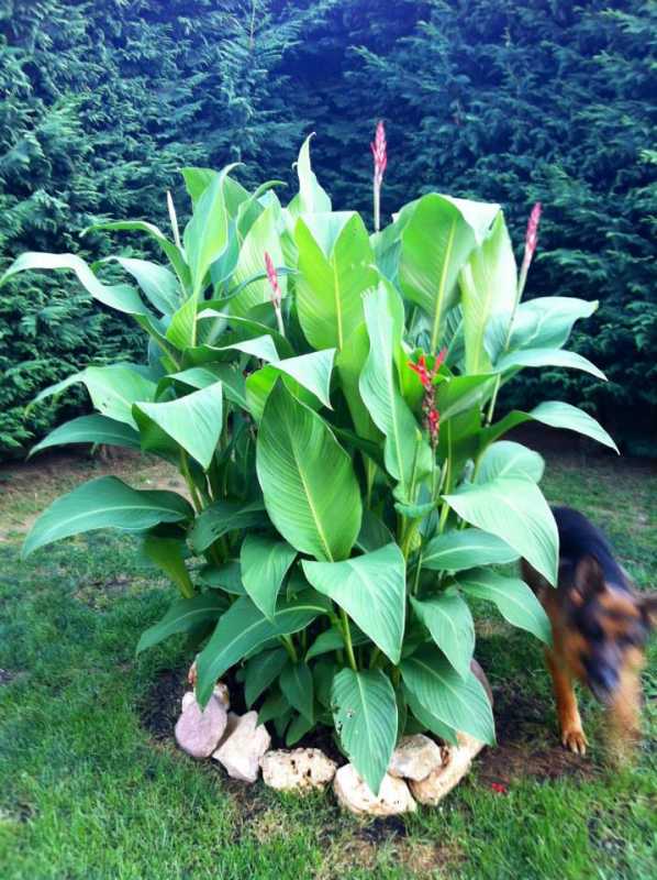 [RIS:Canna indica]nome pianta con rizomi, foglie grandi, lussureggiante, fiori rossi