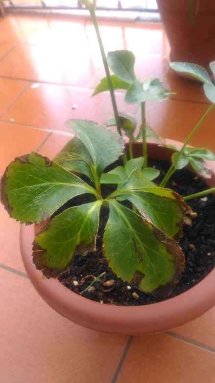 Salve a tutti! Prima di tutto scusatemi se il mio avatar è, per problemi tecnici, così spartano. Volevo sottoporvi un problema: da un paio di settimane circa, uno dei miei ellebori presenta macchie marroni sul bordo delle foglie, che si stanno via via estendendo per dimensione e quantità di foglie colpite, qualcuno sa dirmi di che si tratta? Allego un paio di foto delle foglie colpite. Considerate che, come dicevo, ne ho due (questo, che è un Peach Spot, e poi un White Spotted- potete vederli entrambi nello shop del sito), che ho comprato insieme e che hanno avuto lo stesso trattamento: trapiantati due, tre giorni dopo l'acquisto, circa un mese e mezzo fa', esposti su balcone a est, con sole fin verso le 11. L'esposizione è abbastanza ventosa e per proteggerli li tengo in posizione arretrata, più vicini al muro. Le condizioni dunque sono le medesime, ma uno è malato e l'altro no. Grazie!