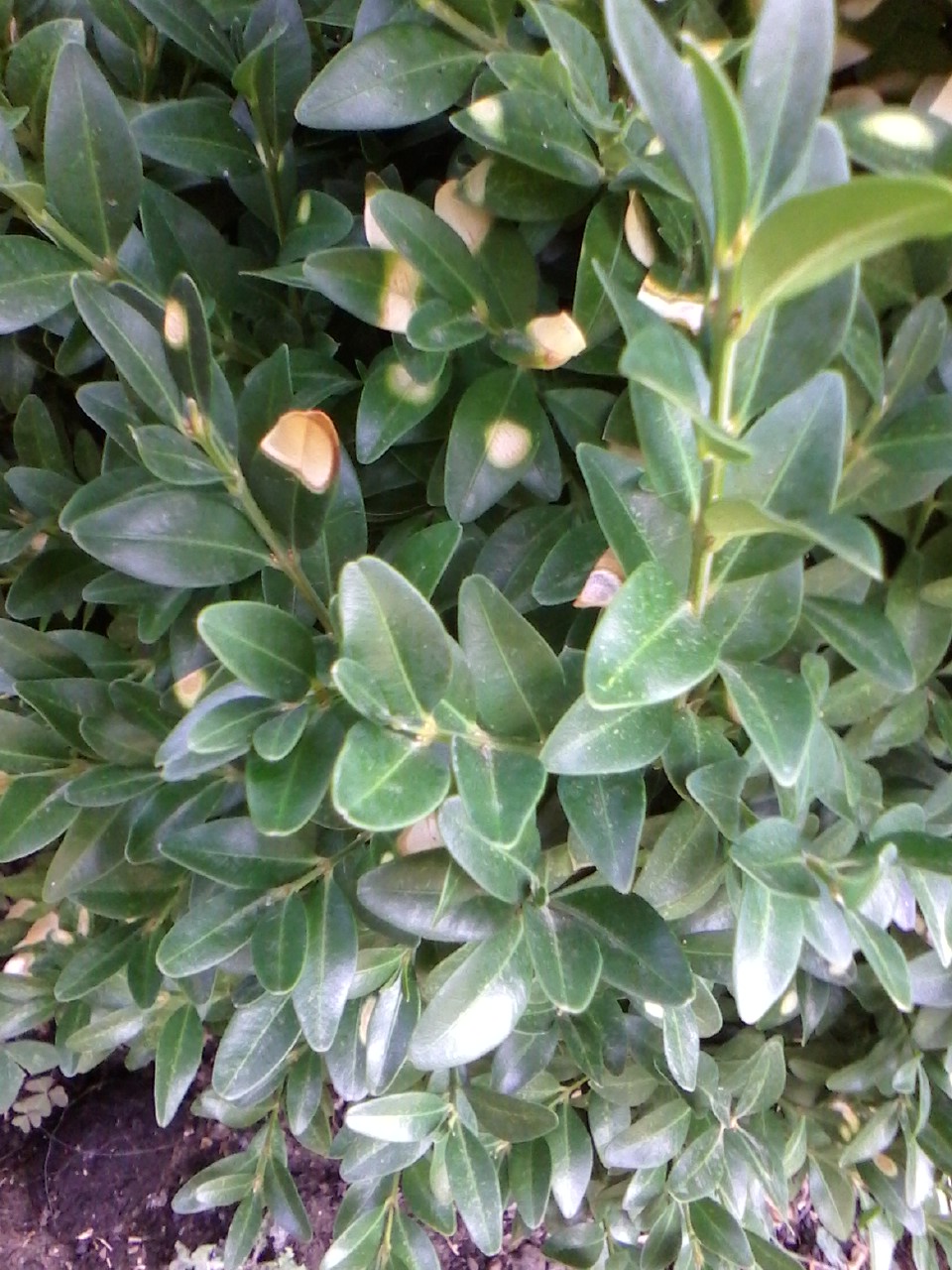 Forse ho scoperto la mia problematica..bruciature da schizzi d 'acqua rovente del tubo di gomma rimasto al sole. Mio padre annaffia i geranei sopra i bossetti non curante a volte dell'acqua surriscaldata.