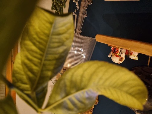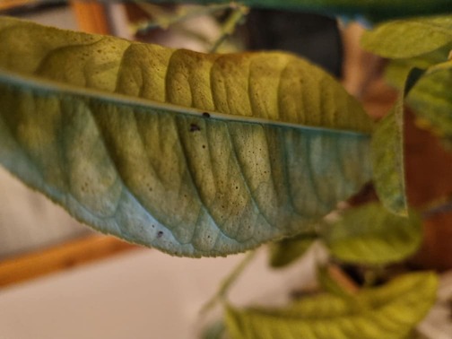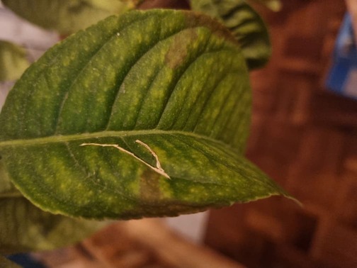 A parte queste cose da fare nell'immediato (le decolorazioni e le foglie che imbruniscono e si stingono/cadono, possono essere semplicemente causati dalla mancanza di luce, dal cambio dall'esterno all'interno), credo si tratti di ragnetto rosso. Puoi usare propoli per giardinaggio una volta a settimana fino alla scomparsa del parassita. Il ragnetto rosso causa decolorazioni e macchie "sfumate" così: