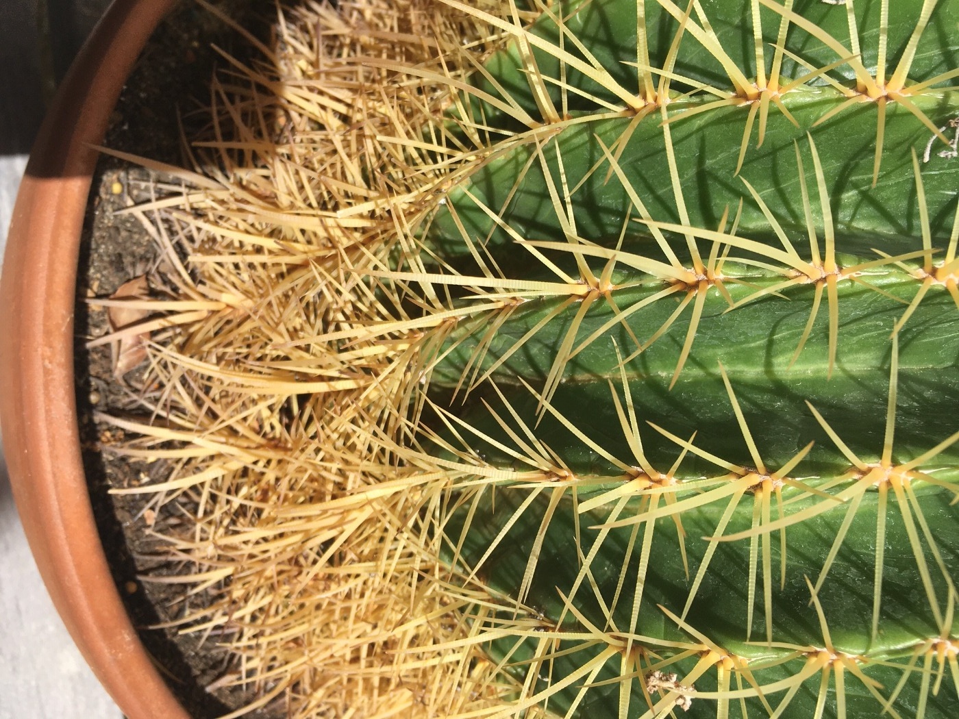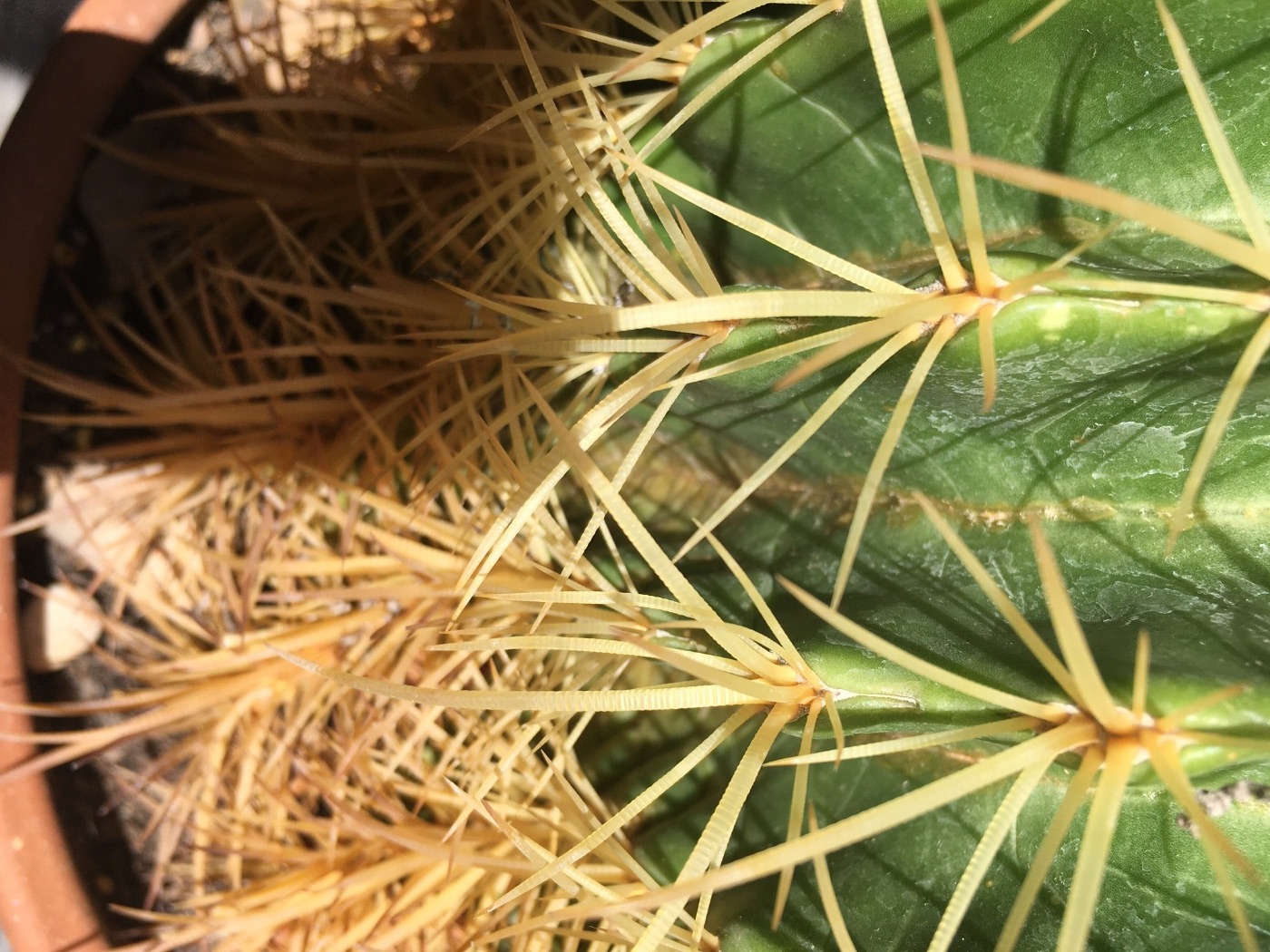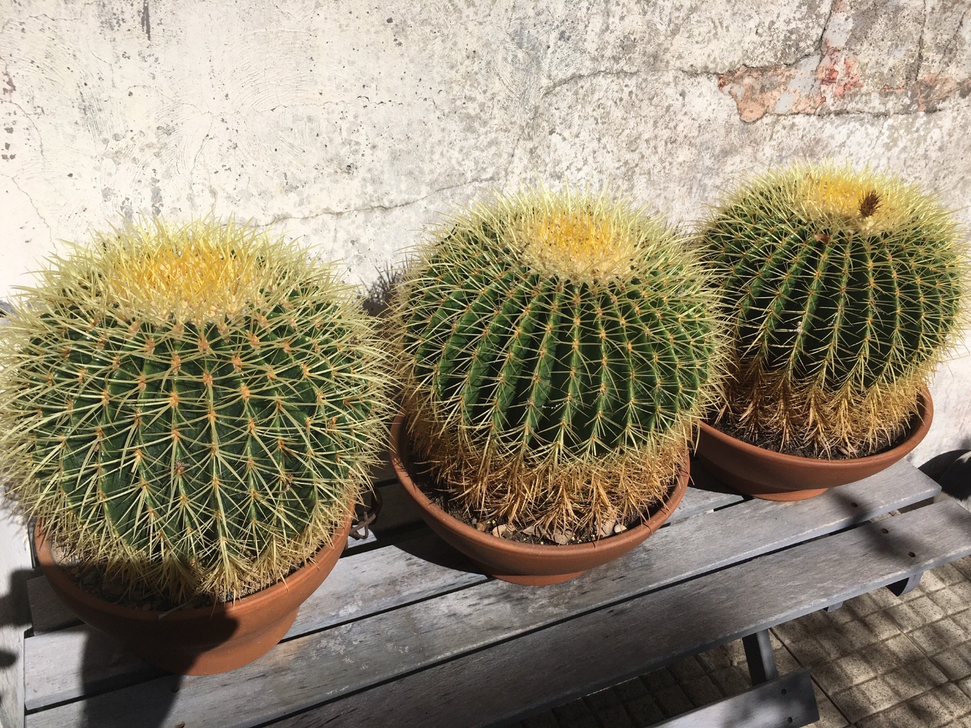 Ciao le mie tre Echinocactus grusonii, in particolare partendo da sinistra la seconda e la terza (in particolare la terza che tra l'latro questo anno per la prima volta ha fatto un piccolo fiore, tende a restringersi sulla parte più bassa, bordo vaso, e tende a crescere in altezza. Anni fa tra la sua base e il bordo del vaso c'era pochissimo spazio. Perchè? Dovrebbe strare bene ha pure fiorito ! Grazie