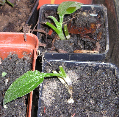 Taglia lo stelo con porzioni di 5-10 cm (importante è che il nodo sopra indicato sia interrato), in terriccio per talee o terriccio di sabbia e torba o perlite e torba, in piccoli vasi (7x7 cm) e realizza talee con il solito metodo (clicca qui), è descritto per le ortensie con porzioni erbacee, va benissimo anche per molte perenni . Lascia una foglia o se troppo grande tagliala a metà.