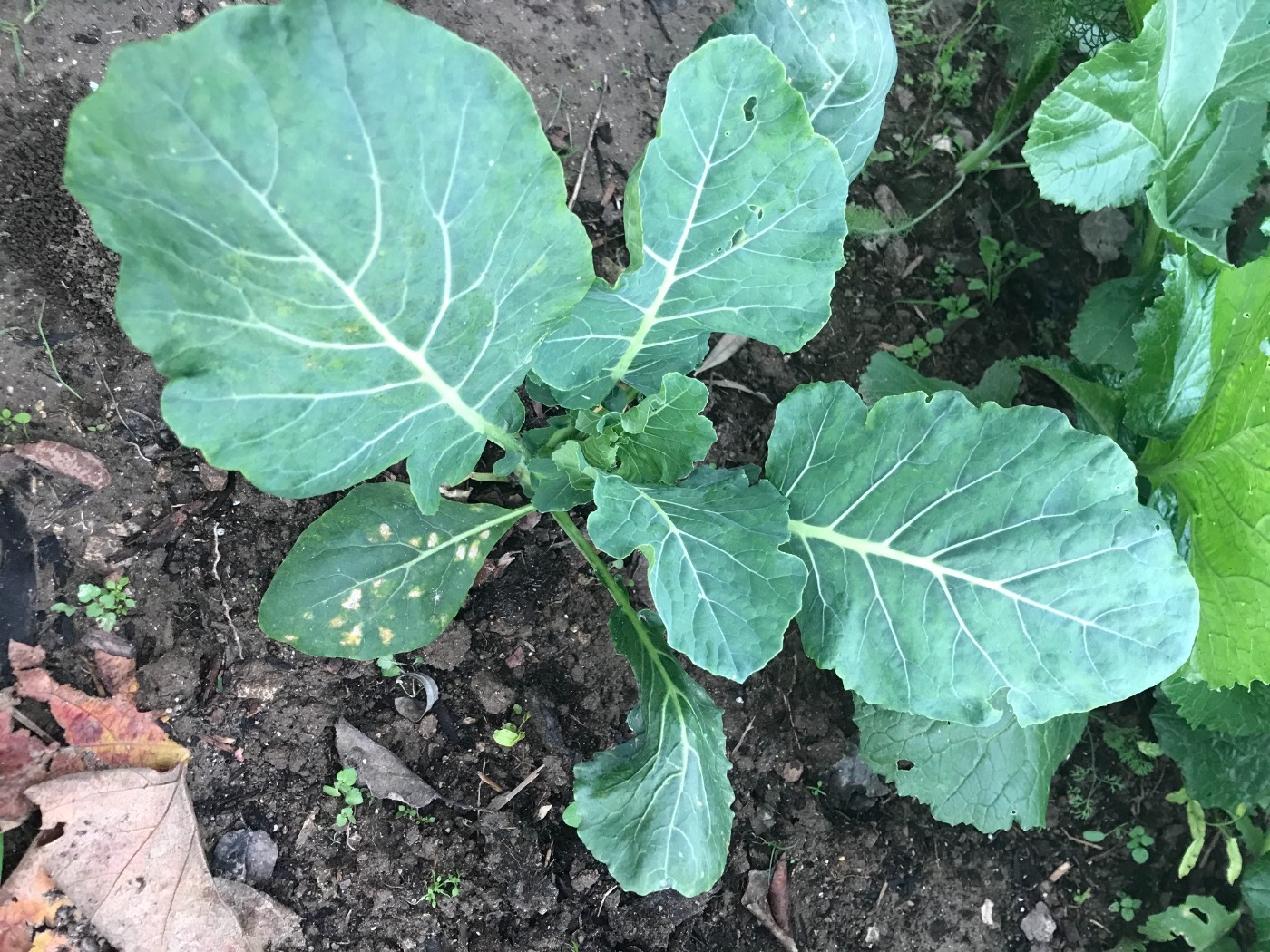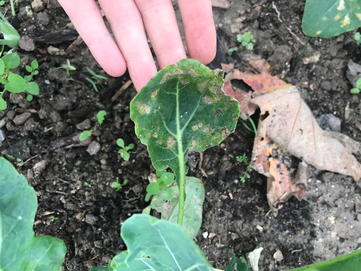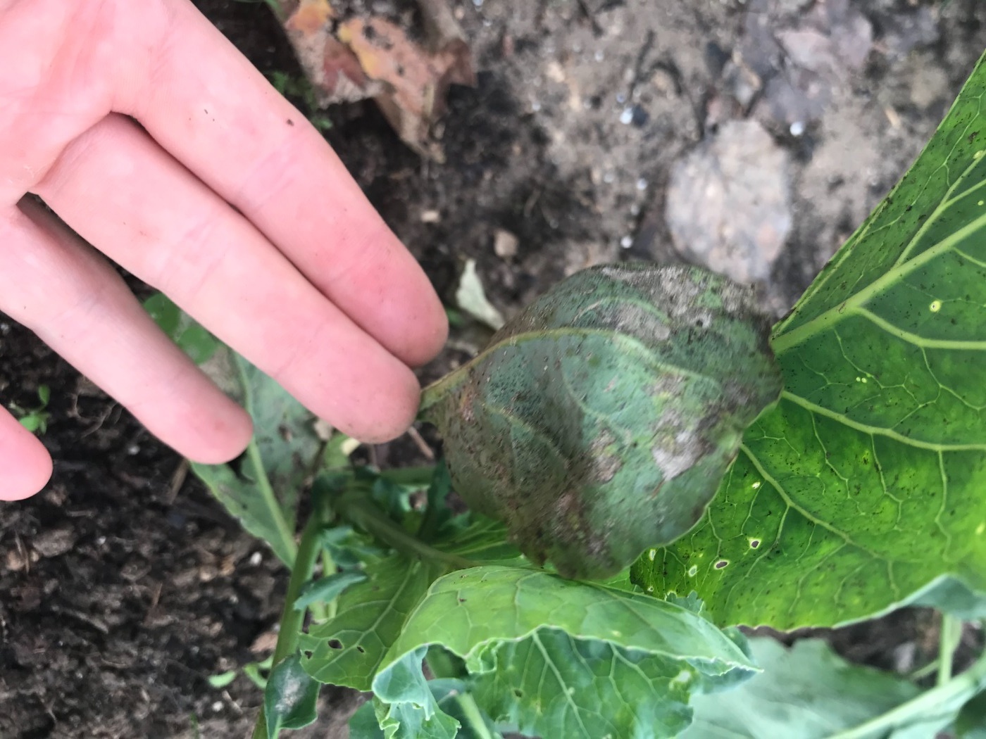 Tuttavia il cavolo romano ha qualche problema, presentando delle foglie ingiallite ed una leggera spolverata (sotto-foglia) di una specie di polvere nera.