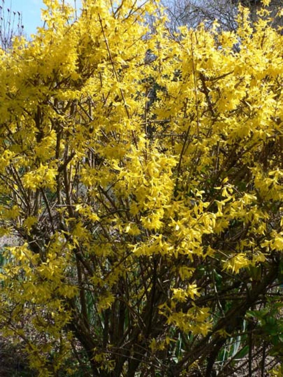 Da sinistra Forsythia 'Golden Times', Forsythia 'Fiesta', Forsythia 'Kumson'