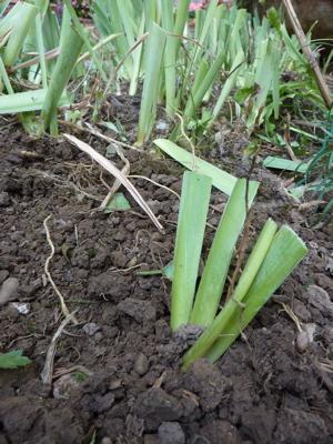 Dovete eliminare le vecchie parti di rizomi (seccuzze, con marciumi, bucherellate e ormai inutili) come indicato in foto: usate una cesoia ben affilata...